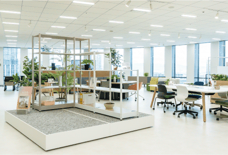 ライブオフィスやショールーム、コーディネートルームなどオフィスデザインするために必要なエリアを設置し、