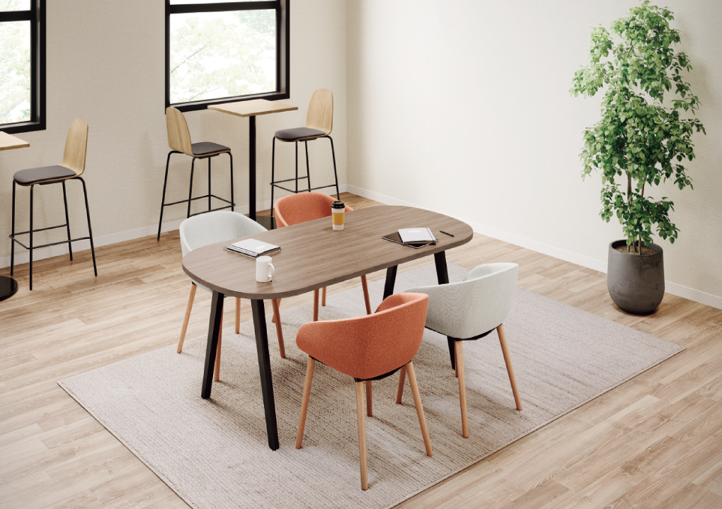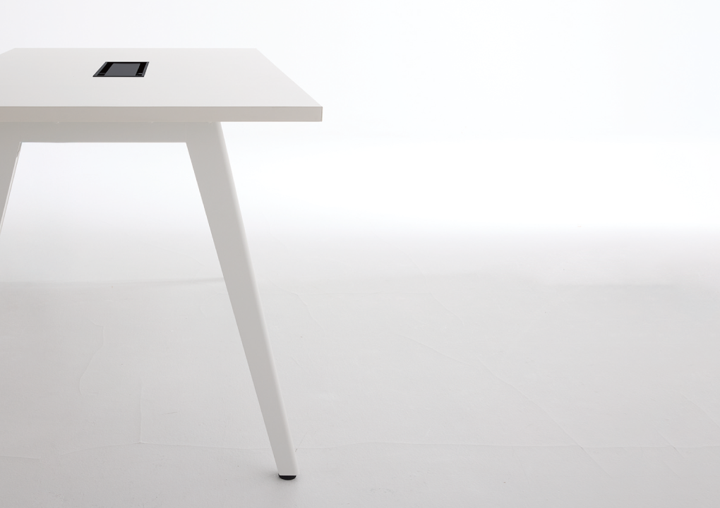 ラウンドスクエアからサークルまで、目的に合わせた豊富な天板形状。スラント脚が空間に抜け感とカジュアルさをプラスし、配線は脚内に収めてすっきりとお使いいただけます。