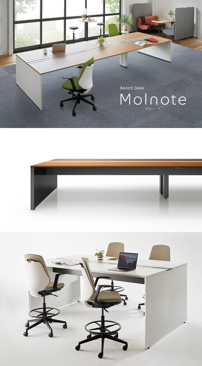 ワーカーが固定席を持たずに空いている席を使って仕事をするフリーアドレス、デスク構成・配置を固定して組織変更の際には家具を動かさずに人が動いて対応するユニバーサルプラン、リラックスしながら伸び伸びと創造性を発揮できるリビングオフィスをはじめ、さまざまなワークスタイルに応じてフレキシブルに使いこなせる“ベンチデスク”。今、海外を中心に人気を集めるこのファニチャーをコンセプトに、さらにデザイン性と機能性を追い求めたナイキの新提案「モルノート」が、日本のオフィス空間を華麗に変えます。