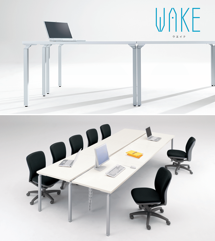 テーブルシステム「WAKE」は、単独使用での個人デスクから、連結してフリーアドレスプランやデスクミーティングテーブルなどにも簡単・スムーズに移行が可能。業務内容の変化やスタッフの人数の増加にもしなやかに対応でき、レイアウトの変更も容易です。
