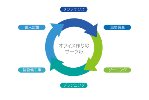 お客様のビジネススタイルやニーズを製品に反映させるソリューションビジネス、施工や環境の維持改善、さらにオフィスの移転からアフターサービスまで一貫して提案する。それが私たちの販売姿勢です。