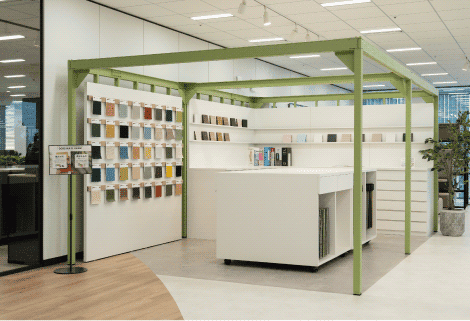 ライブオフィスやショールーム、コーディネートルームなどオフィスデザインするために必要なエリアを設置し、