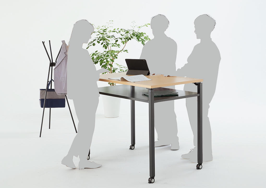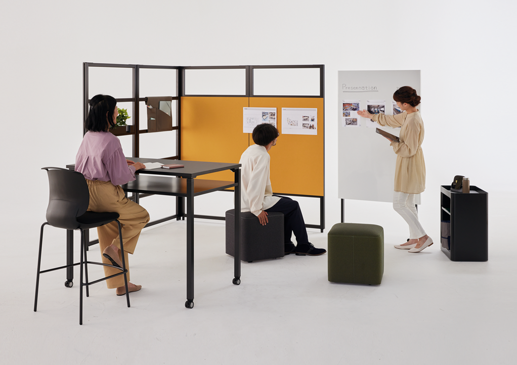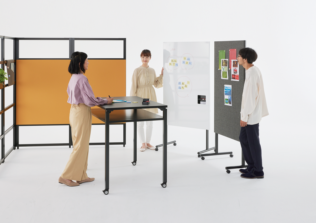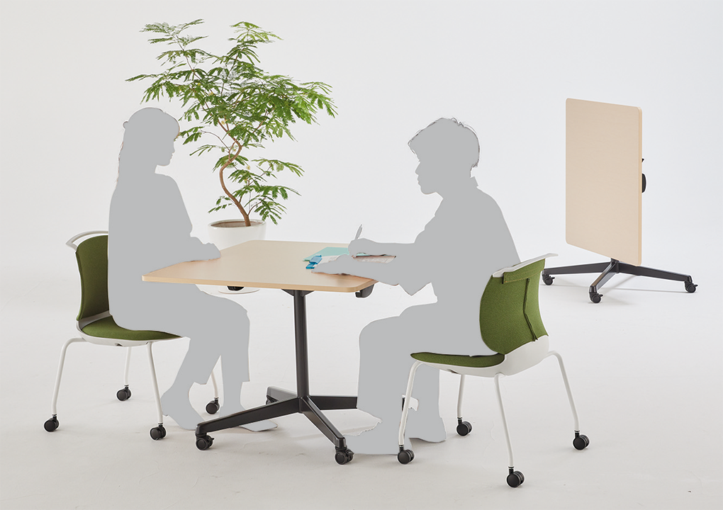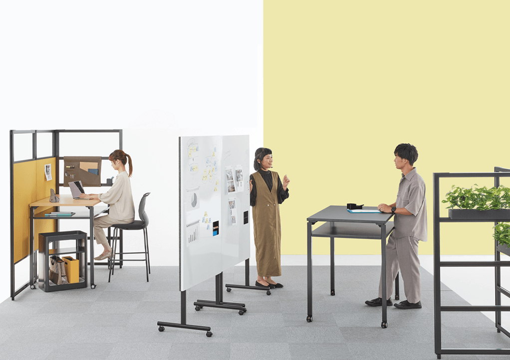 思い立った時に集まって打ち合わせをしたり、徹底的に議論したり、メンバーにプレゼンを行ったり…。キャスター付きのテーブル、チェアー、モニタースタンドなど多彩なアイテムを目的や人数に合わせて自由にセッティングすることで、コミュニケーションがもっとアクティブになり、様々なアイデアが生まれる環境を簡単に創造できます。