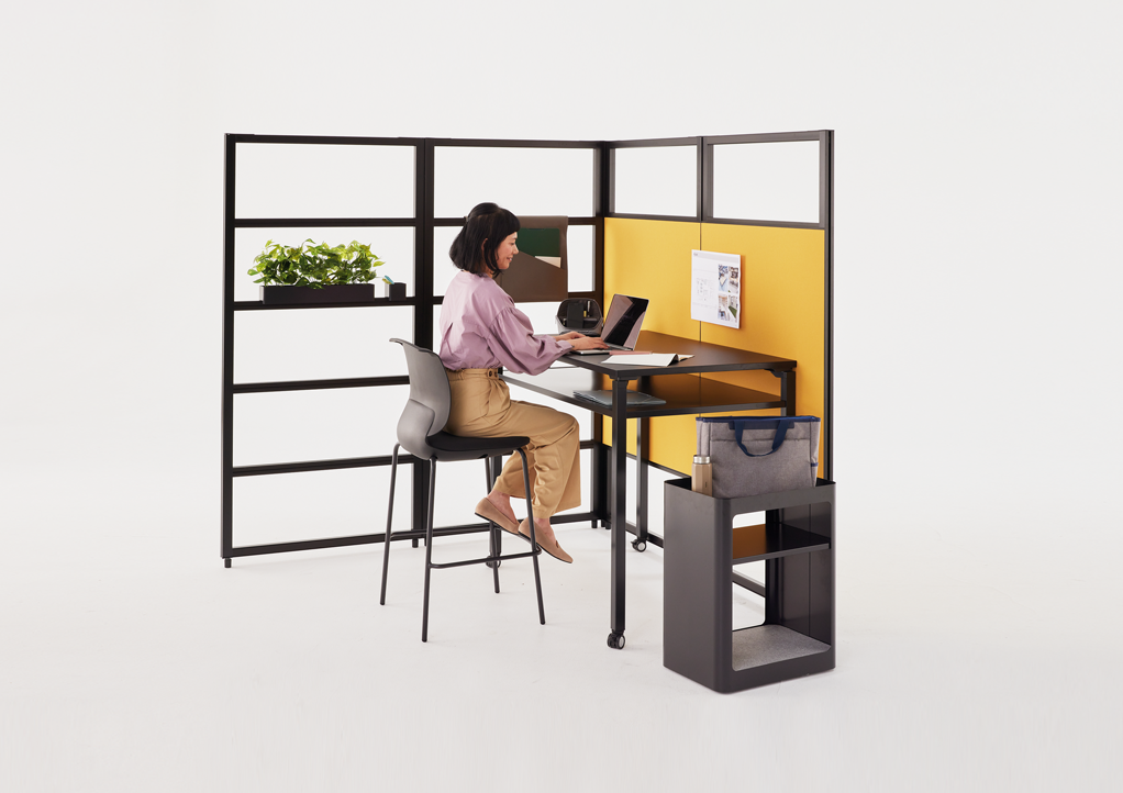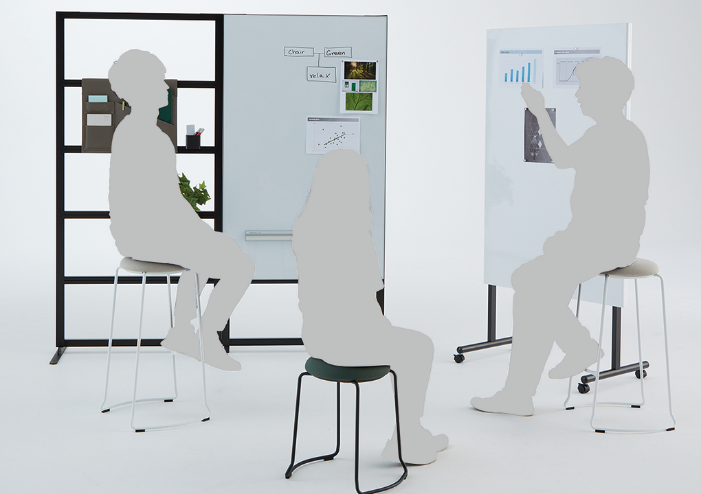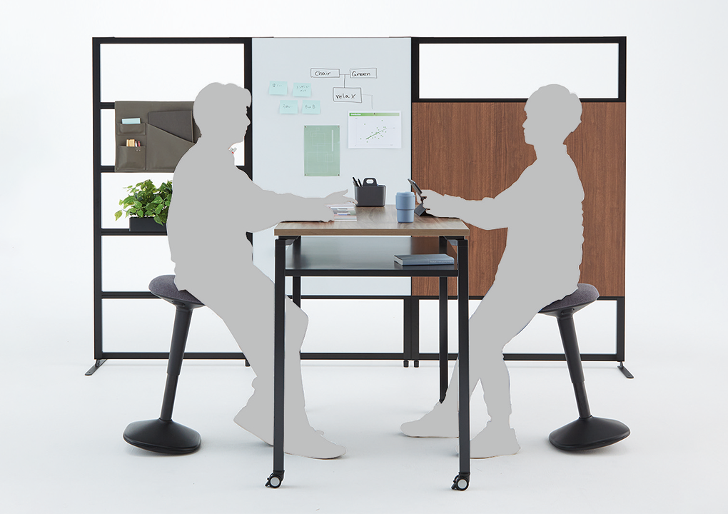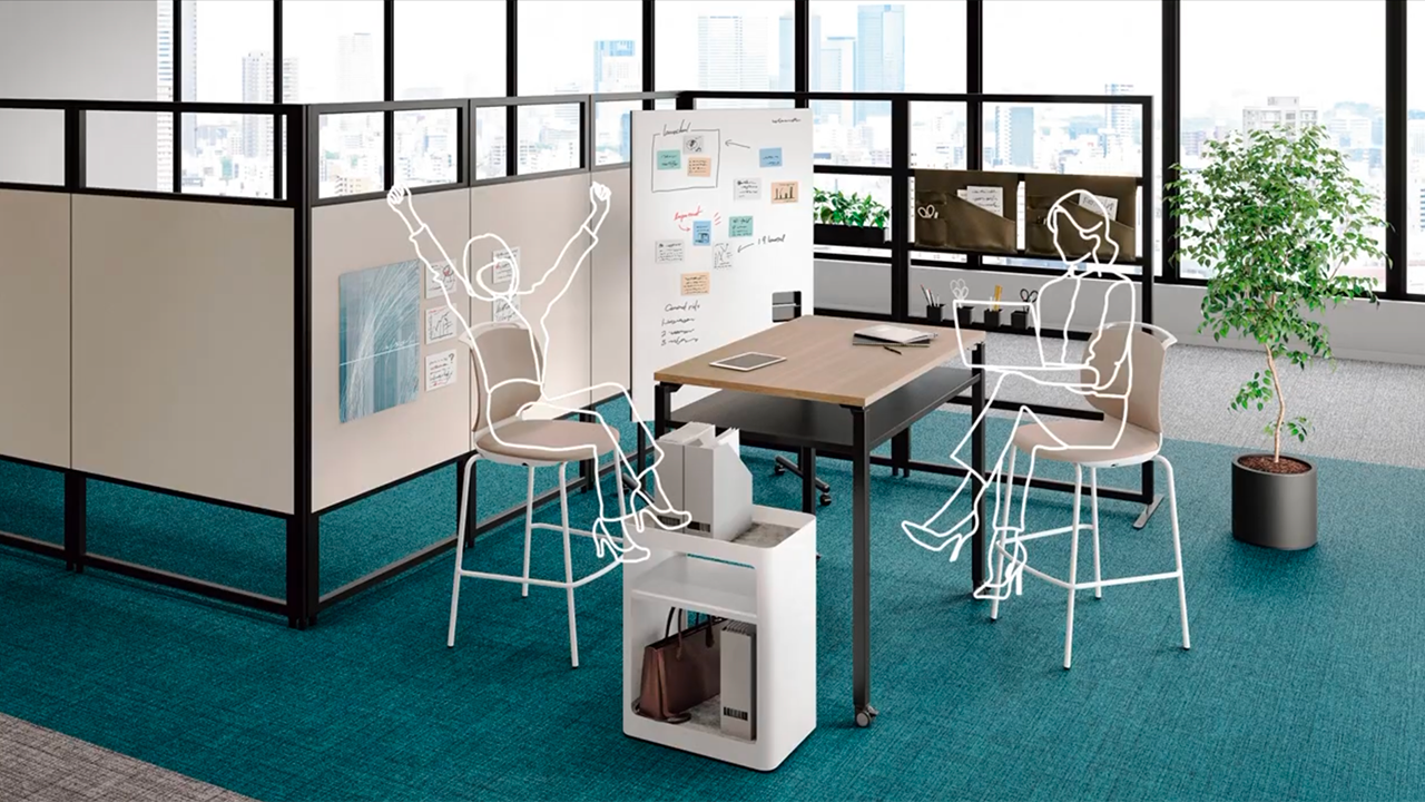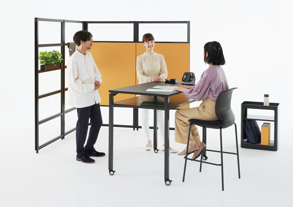 思い立った時に集まって打ち合わせをしたり、徹底的に議論したり、メンバーにプレゼンを行ったり…。キャスター付きのテーブル、チェアー、モニタースタンドなど多彩なアイテムを目的や人数に合わせて自由にセッティングすることで、コミュニケーションがもっとアクティブになり、様々なアイデアが生まれる環境を簡単に創造できます。