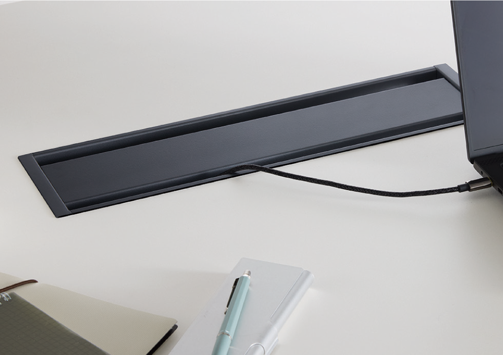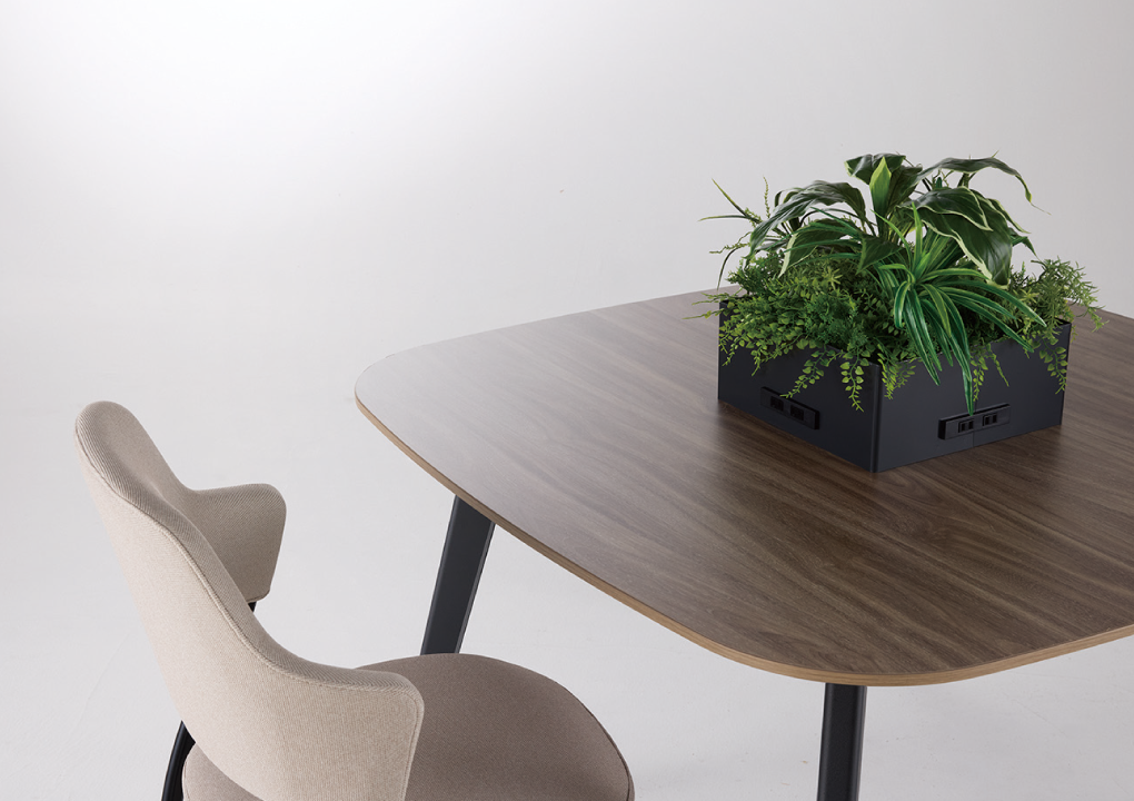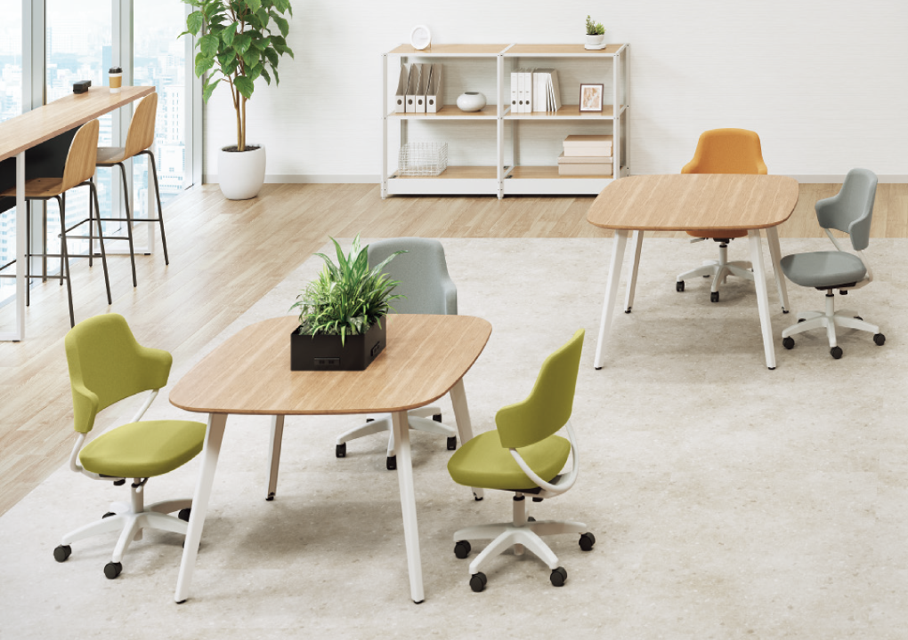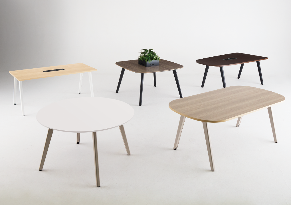 ラウンドスクエアからサークルまで、目的に合わせた豊富な天板形状。スラント脚が空間に抜け感とカジュアルさをプラスし、配線は脚内に収めてすっきりとお使いいただけます。