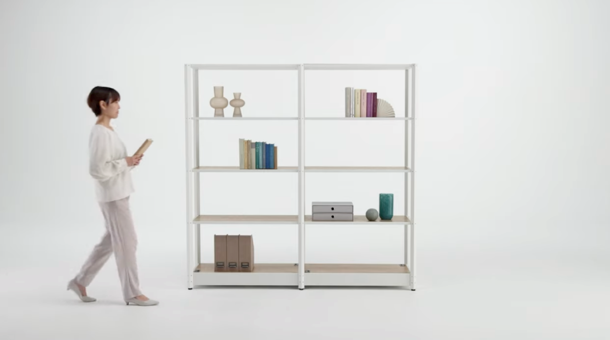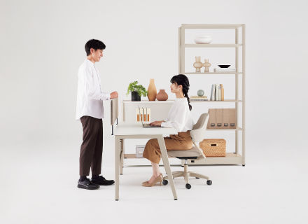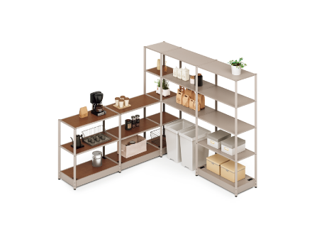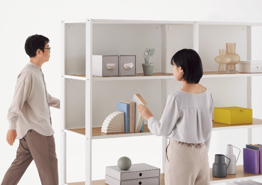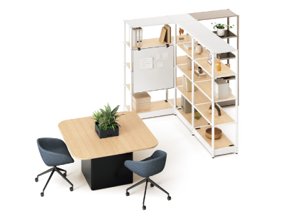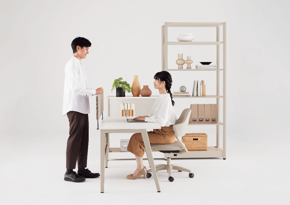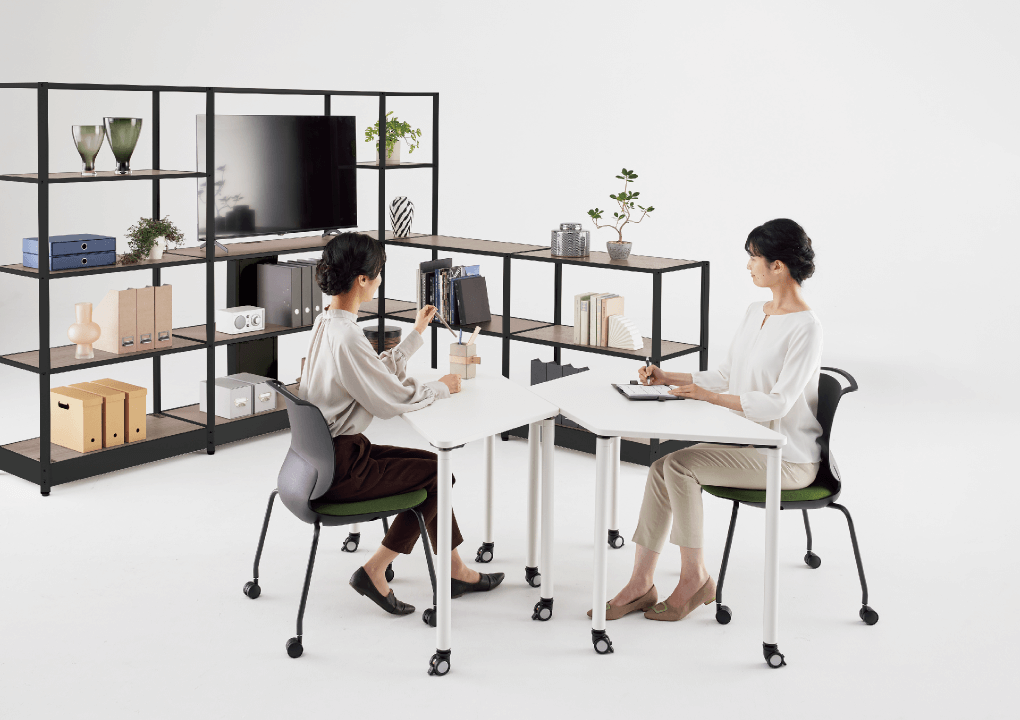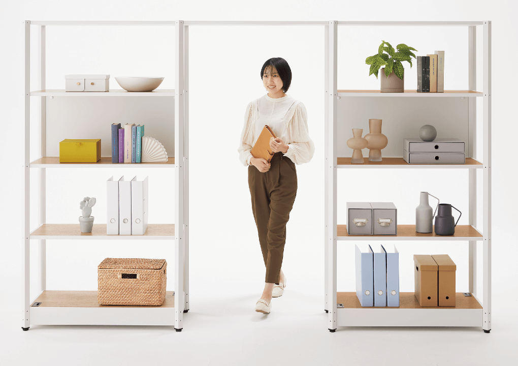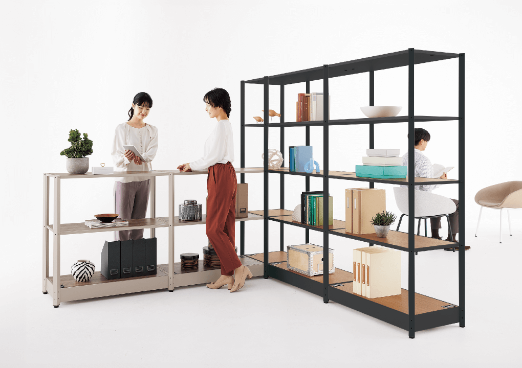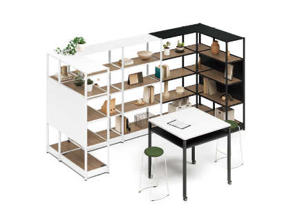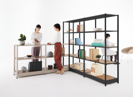 間仕切りと収納の役割を兼ね備えた軽やかなシェルフ。セクションの内と外でつながりを感じることができ、自然とコミュニケーションも生まれます。
