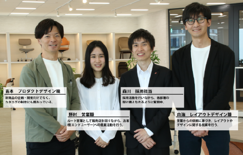 高本僕は、商品開発での差別化についてですね。例えば椅子だと、機能性やデザイン性、価格帯など様々な要素がありますが商品ごとに違いをつけて、きっちり差別化をはかるように心掛けています。お客様にも商品の特長をつかんだうえで、購入してもらいたいですね