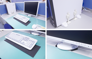 デスクトップPCの転倒・落下はスタッフの方々に危害を与えるだけでなく、事業再開時の障害にもなります。そこで、机上のディスプレイは「薄型モニターストッパー」、パソコン本体は「リンクストッパー」で固定し、キーボードには「移動防止マット」を採用しました。