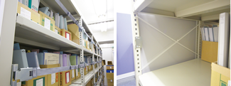 ラックが転倒すると大ケガの原因になると同時に、避難経路を塞いでしまう可能性もあります。そこでラックを向かい合わせで設置している場合は、上部を「転倒防止連結バー」で連結。さらに地震時に書類などが崩れ落ちないように前面には「落下防止ベルト」、側面には「落下防止バー」と「サイドパネル」を設置しました。