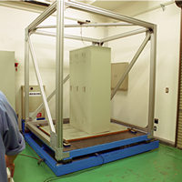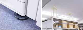 彦根工場では耐震試験装置を導入し、さまざまな家具や地震対策金具などの機能性をテスト。「転倒防止」「落下防止」「移動防止」の3点をテーマに掲げ、防災オフィスづくりに役立つ家具を開発・製造しています。また、地震時の落下物を想定し、天板を含めたデスクの強度試験も実施。デスク下が緊急時の避難場所となるように、強度に優れた製品づくりを行っています。