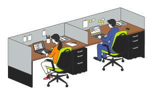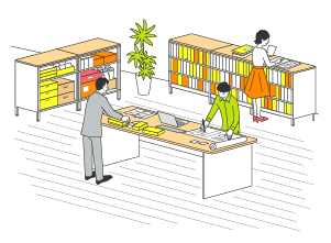 一人ひとりの効率的な執務はもちろん、活発なコラボレーションもスムーズに行えるオフィスプランです。固定席で集中して作業ができる執務エリアのまわりに、ソファーエリアやミーティングエリアなどを配置。気分転換に自席を離れて会話をしたり、アイデアを出し合ったり、共同作業も捗ります。特に集中して作業を行うことが多く、打ち合わせや共同作業を時折行う働き方におすすめです。