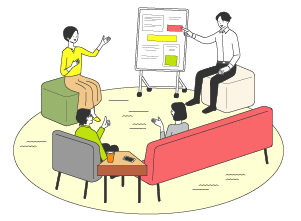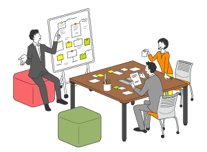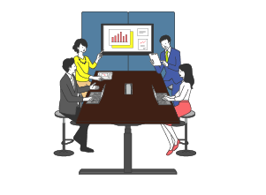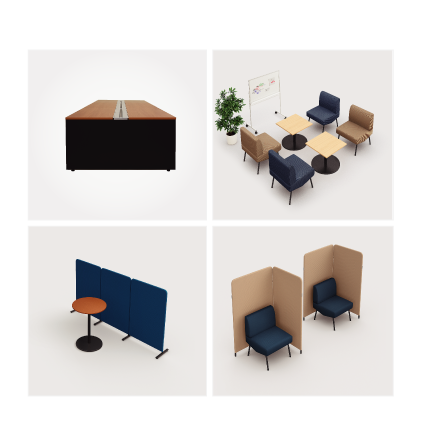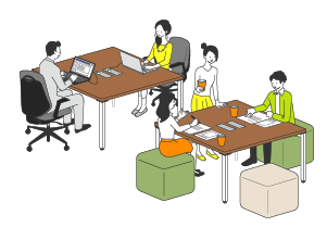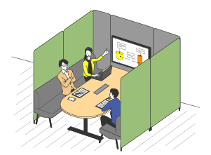 シッティングスタイルで、長時間の討議に適した場です。ミーティングボードの併用により、アイデア出しや、まとめ作業なども行えます。