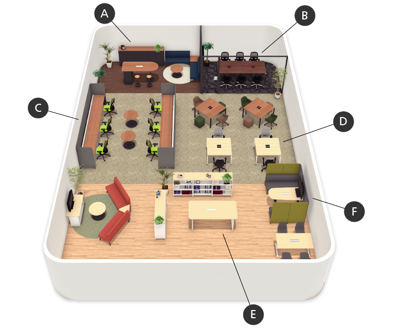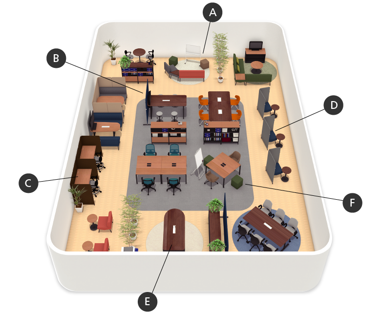 その日の気分や仕事内容で働く場所を自由に選べる、ABW(Activity Based Working)の考え方を取り入れたオフィスプラン。自席をなくして好きな場所で執務ができ、デスクワークをはじめ、コンセントレーション、コラボレーション、リフレッシュメントなど、多様な使い方に対応します。さまざまな形でコミュニケーションやコラボレーションを行い、熟考の場も必要な働き方におすすめです。