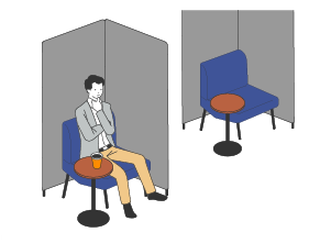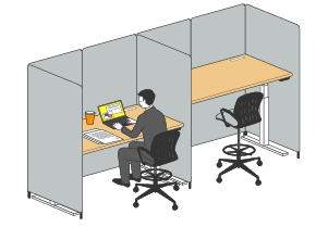三方が囲まれることで視界に余計なものが入らず、高い集中で作業が行える場です。上下可動デスクにより、集中度の高い立ち姿勢での作業も可能です。